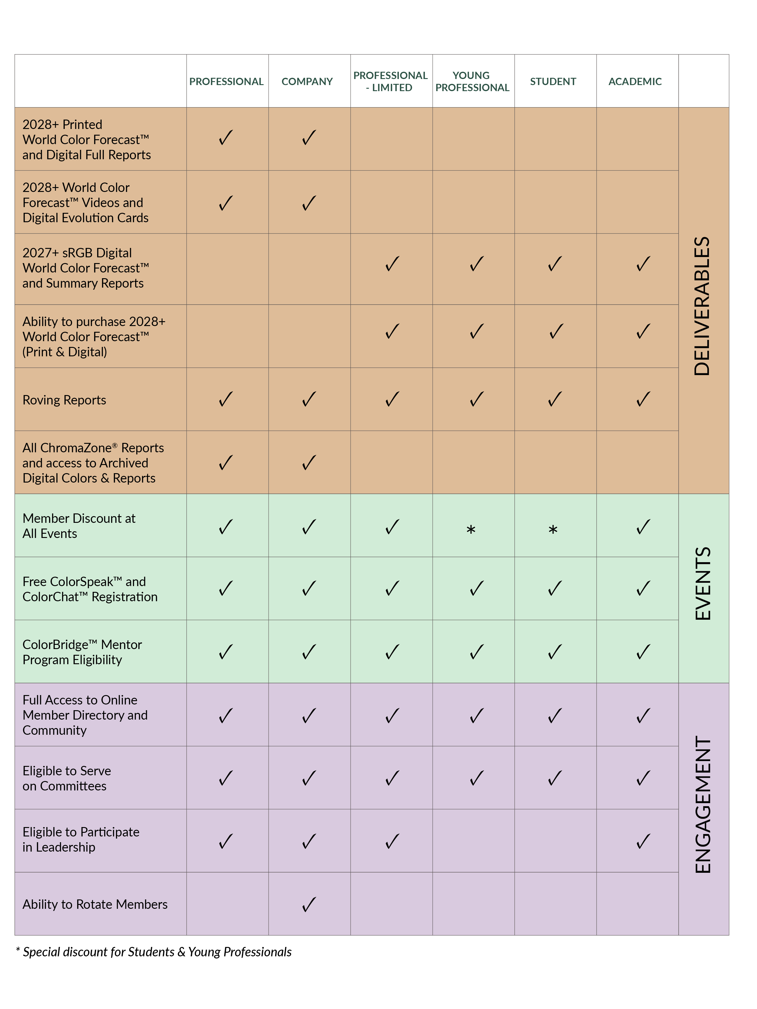 Available for full-time students in art, design, color, or related field of study at any college or university. Includes the digital 2027+ World Color Forecast™ with sRGB notations and reports for the Asia Pacific, European, Latin American and North American regions. Plus, Student discount rates at CMG events, complimentary ColorSpeak™ and ColorChat™ registration, and eligibility for ColorBridge™ mentoring. This membership is a great way to get started on your colorful career journey!